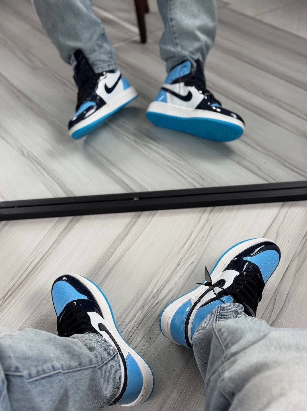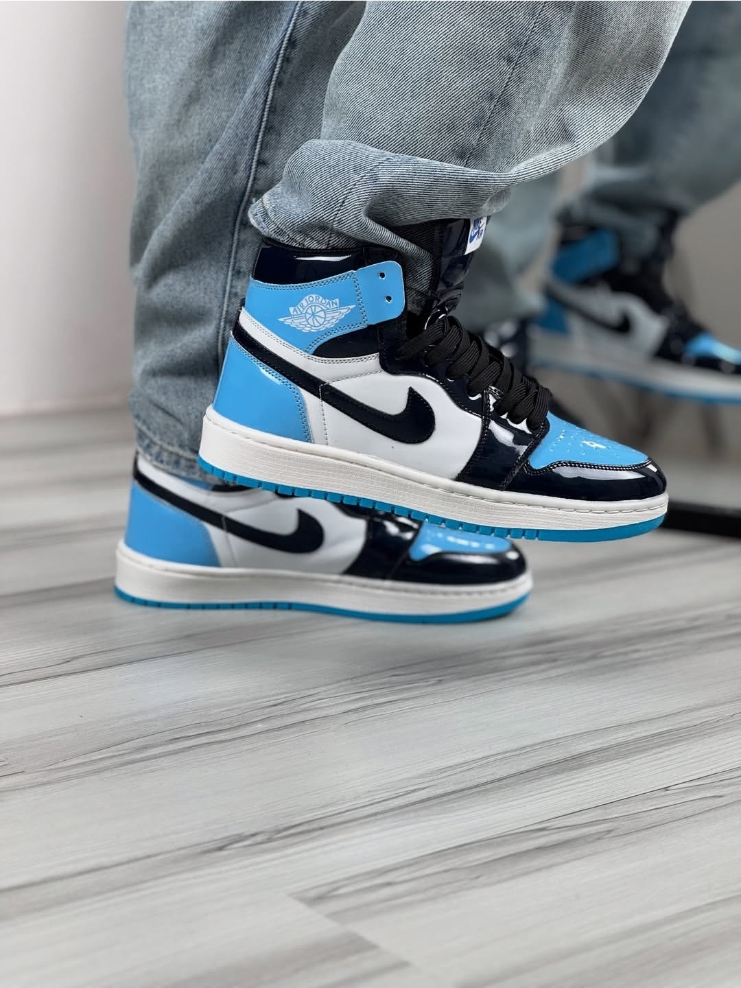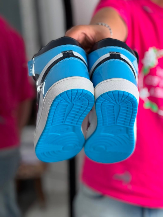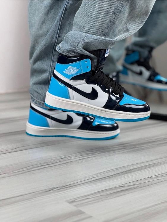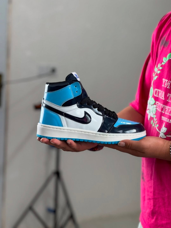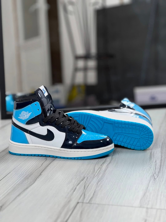 جردن وان ساقدار مردانه و زنانه رنگ جذاب مشکی سفید و آبی رویه ورنی زیره ترمو عطری دور دوخت و کف دوخت شده بالاترین کیفیت ممکن در بازار